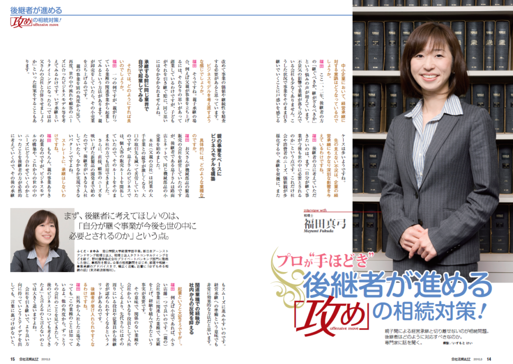 ■会社法務A2Z 2010年3月号「成功する経営承継・M&A」「プロが手ほどき 後継者が進める『攻め』の相続対策!」インタビュー及び執筆記事掲載